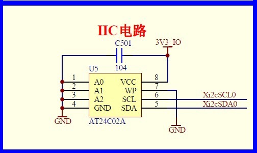 開發板上IIC實際連接電路,AT24C02為EEPROM,大小為2k位,256字節