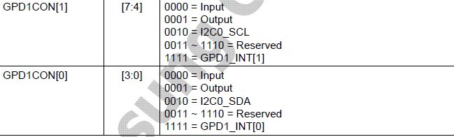 配置GPD1CON[0] 和 GPD1CON[1] 為I2C 功能: