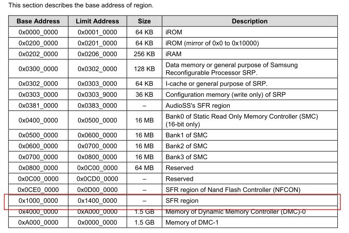 查看Exynos4412芯片手冊的第二章2 Memory Map(30頁)地址映射表,我們可以看到Exynos4412的特殊功能寄存器絕大部分都放到了0x1000_0000到0x1400_0000的地址空間。