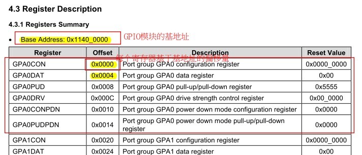 查看芯片手冊,第四章4 General Purpose Input/Output (GPIO) Control,4.3節(41頁)寄存器描述,有完整的GPIO模塊的寄存器描述表。我們可以得到GPIO模塊的基地址和每個寄存器相對基地址的偏移量。