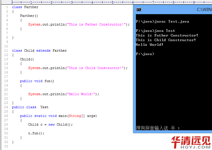 我們知道,使用new操作符,我們會調用類中相應的構造器,所以,在執行"Child c = new Child(); "這條語句時,我們應該去調用子類中無參的構造器,但是在子類Child中貌似沒有構造器。這時大家要注意了,其實我們每個類中,實際上是有一個無參的構造器的。但是,如果程序員自定義了構造器,這時我們只能使用自己的構造器。所以,這時也不難理解,為什么我們new子類實例,是沒有報錯的了!所以,我們添上一個無參構造器,結果也是一樣的。