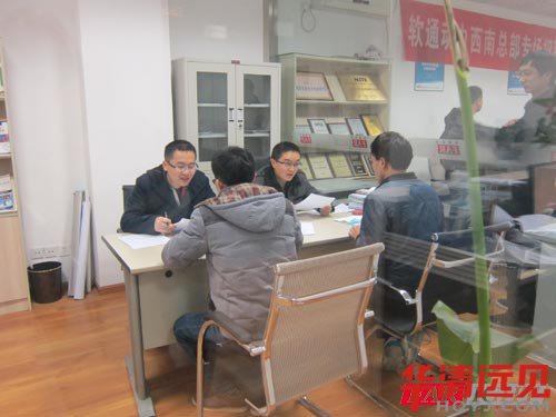1月7日下午2點華為技術有限公司兩位技術面試官和軟通動力人事王小姐以及技術覃先生一行四人來到華清遠見成都中心。成都中心就業部龔老師和王老師熱情接待了他們,并向他們介紹了參加專場招聘人員的基本情況。