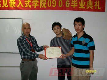學(xué)員在整個(gè)學(xué)習(xí)過程中溝通能力、解決問題能力等都得到了大副度的s提高。結(jié)業(yè)典禮后,學(xué)院頒發(fā)了優(yōu)秀學(xué)員獎(jiǎng)和項(xiàng)目團(tuán)隊(duì)優(yōu)秀獎(jiǎng)。本期的優(yōu)秀學(xué)員分別由謝強(qiáng)、李青綜合評(píng)分高的兩位同學(xué)獲得,優(yōu)秀團(tuán)隊(duì)由李青帶隊(duì)的“1+1=8”小組獲得。中心負(fù)責(zé)人梁老師為學(xué)員頒發(fā)了證書和獎(jiǎng)品(簽名筆和筆記本)。結(jié)業(yè)典禮當(dāng)天,0906期班有幾名學(xué)生因?yàn)橐呀?jīng)通過企業(yè)面試而未能來參加典禮,還有一些學(xué)生也因?yàn)楫?dāng)天有企業(yè)的面試而不能到達(dá)現(xiàn)場(chǎng),不過相信能夠在嵌入式企業(yè)一線工作崗位上慶祝自己從華清遠(yuǎn)見教育科技集團(tuán)畢業(yè)會(huì)格外有意義!