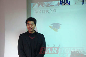為促進學員之間的相互了解,每個學員輪流上臺進行3分鐘的自我介紹以及3分鐘的班長和學習委員的預選,李老師給大家列了一個自我介紹提綱。通過學員精彩的自我介紹,發現本班學員有著不同的背景,即將畢業的學生、已經上過班的都有。大家在預選班長和學習委員過程中,都非常謙虛,表現了一種團結互助的精神,本環節將整個氛圍推向高潮,后預選出2名作為班長人選,后結果,將通過大家的相處后,一周后再進行民選決定。學習委員已經確定。