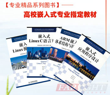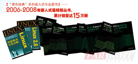 與眾多培訓機構選擇將自己的教材僅作為內部使用不同,華清遠見在成立之初,就并本著“誠信、創新、開放、合作”的企業精神,從06年到08年先后自主編寫并公開出版了業內熟知的“黑色經典”系列嵌入式專業圖書,截止到2009年底,華清遠見已公開出版近40本專業圖書,這些圖書早已成為嵌入式行業權威的專業書籍,數年蟬聯嵌入式圖書榜首,成為廣大嵌入式愛好者的貼心學習教材,累計銷量超過15萬冊,保守估計有超過十萬的讀者從中受益。而在2009年華清遠見新出版的專業圖書更是成為高校嵌入式專業建設的有力支撐!