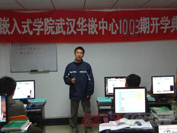 首先由武漢華嵌中心負責人李家凱老師為開學典禮致辭,李老師首先向學員們介紹了嵌入式行業的前景、學員就業前景以及與眾多企業合作的單位做了簡單的介紹,并講解了華清遠見的發展歷程和武漢華嵌中心成立的過程,同時對本期的課程體系設置、授課安排的情況做了詳細的介紹,并要求每位學員都做好課前預習和課后復習,要養成良好的學習習慣,勤動手做筆記。接著,李老師照常談了自己對學員們的幾點期望,并鼓勵新學員努力學習,早日成為一名合格的嵌入式高級人才。后,李老師強調了學習紀律的問題,要求各位學員要端正學習態度,遵守規章制度,把握好今天。