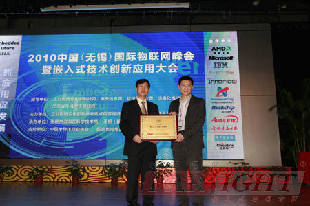 2010年4月20日,物聯網峰會暨嵌入式技術創新應用大會在無錫太湖飯店隆重舉行。本屆大會是在工業和信息化部科技司、電子信息司、軟件服務業司、信息化推進司的指導下,在無錫市人民政府的大力支持下,由工業和信息化部軟件與集成電路促進中心(CSIP)、無錫市濱湖區人民政府聯合主辦的專業盛會,外相關知名企業悉數到場,共同圍繞新興的物聯網產業,探討應用市場和技術挑戰,展望嵌入式技術在物聯網中的應用前景,著力推動嵌入式等與物聯網有關的各項技術和方案在各行各業的應用。華清遠見作為嵌入式人才培養和人才服務的旗艦品牌,在本次大會上榮獲“嵌入式人才服務特別獎”,成為唯一獲得此殊榮的專業培訓機構! 同時,由CSIP組織業內專家評審團選出的“2010十大優秀嵌入式系統創新解決方案”也在大會當天對外公布,上海慶科信息技術有限公司、盛科網絡(蘇州)有限公司、威盛電子、ADI、深圳市愛國者嵌入式系統科技有限公司等10家公司的方案獲獎,方案覆蓋物聯網、網絡通信、智能電網、汽車電子、醫療電子、移動終端、數字電視、安防領域,展示出芯片設計廠商、方案廠商以及整機廠商在應用創新上的豐碩成果。