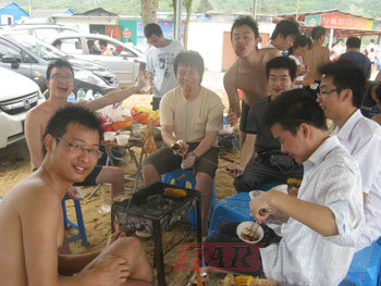 時間飛快,一轉眼就過去了兩個小時了,游完泳之后,大家都感到餓了,開始我們的主題活動——燒烤。老板已經把東西準備好了,大家卷起袖子,七手八腳的開始串上東西,開動了。很多同學是第一次燒烤,老板看到大家串好以及燒烤了的東西,慘不忍睹,語重心長地向大家解說著該怎么串食物才烤的快,烤的好,什么時候才開始涂上油,醬油或蜂蜜,辣椒之類的,大家看著自己的杰作,才知道自己做的全都錯了,怪不得雞腿或雞翅外表已經黑了,但里面卻還是生的,感嘆道:“唉,什么都是要學了才知道,以前看人家燒烤,以為是一件很簡單的事情,沒想到做起來是有那么多門道的!”大家感嘆不已!