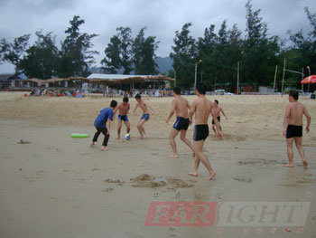 燒烤完了,不知道是誰提議要進行一場沙灘足球。于是,分成兩隊,進行對抗。在鋪滿細細的沙子的沙灘上,足球穿梭在N只腳下,來回的奔跑著,更帶動著身后的幾個人,足球往東,他們不敢往西,完全是一個為合格的“領頭羊”!汗水和沙灘上的海水融匯在一起,笑聲和海浪聲交雜在一起,一切都顯得那么的和諧、自然,讓人看了都不自覺的嘴角上揚。