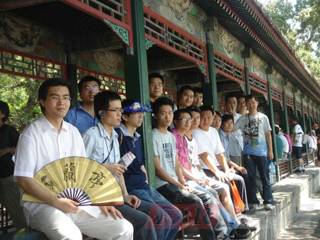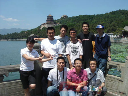 6月20日上午10點。我們相約在頤和園正門的售票處集合。對于遲遲未到的幾位學員,大家都翹首盼望,如果時間再長一點,恐怕長頸一族即將誕生了,呵呵!在這段時間里大家聚在一起開始天南地北的聊天,輕松愉悅的心情洋洋灑灑,綻放在每個學員的臉上。10:30分,姍姍來遲的同學,每一個都是我們的期盼。對于遲到者,我們大家想出一個整人的辦法,我們擺成一弧形,讓他們蹲在中間接受我們直接的表達方式。10:40分,我們出發在頤和園正門合影,露出開心的笑容。大部隊終于開始向前挺進,前進,天氣很好,心情實在是很好!