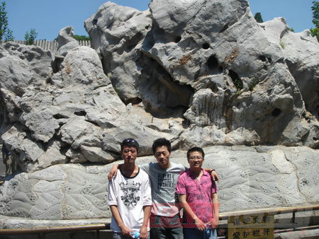 我們的大隊伍,沿著昆明湖前往十七孔橋,有時湖中的小魚把我們腳步拖住,有時在被同學稱之為“海枯石爛”的景點前留下我們的合影,去見證這一“愛情至高無上的名言警句”,據說這“?菔癄”俗名為“敗家石”,在乾隆年間,耗資巨大,將此石運到此處,但后因用處不大,扔至郊外。故取名為“敗家石”。