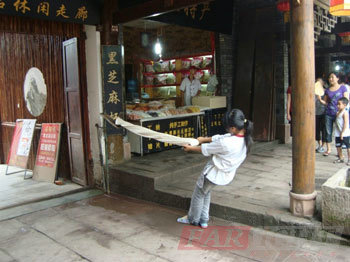 很快,就到了黃龍溪,一個名符其實的古色古香的地方,清晰宜人的小鎮。長長的溪流中滿是戲水游玩的小孩、大人,游玩的水槍讓穿梭的行人防不勝防,讓水的涼意無處不在;石頭輔塹的街道,古老的水車上,綠蔭下,熙熙攘攘的人群隨處可見,古鎮儼然是正在進行一場盛大的PARTY,而我們的大軍只是姍姍來遲了一會兒。