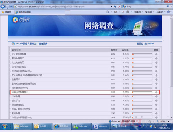 本次騰訊網教育頻道“2010回響教育年度總評榜”入圍名單的終產生,是在2010.11.15-2010.12.05長達1個多月的時間內,由廣大的網友投票而上榜,在整個活動舉辦過程中,主辦方對整個投票的過程進行了嚴格的監督,而這種方式也更加凸顯出本次評選活動的公正性,華清遠見終以3185票,占總票數的5.35%而上榜。