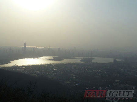 終于功夫不負有心人,我們來到紫金山山頂。紫金山沒有北方高山的巍峨挺拔,也沒有南方群峰的溫柔靈秀,但卻有著一份屬于她自己的從容與淡泊。站在紫金山頂,不僅讓我們享受著燦爛的陽光和清新的空氣,更有一種讓人精神松弛的散淡氣息。即使是我們這些匆匆的行旅者,在這樣的氛圍中都不覺隨意、輕松起來。在這樣的情境下,任何人繁雜的思緒都會不自覺地平靜下來。在山頂向下望去有“一覽眾山小”的感覺。