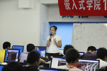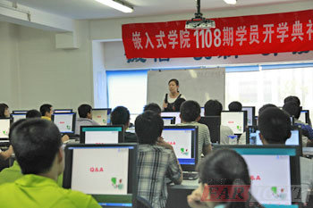 緊接著由華清遠見教育科技集團院長季老師為開學典禮致辭,季老師對嵌入式行業的前景及與企業合作的單位授權等都進行了的介紹,特別針對2011年的十大新興技術與嵌入式研發的密切相關性進行了分析,也會目前大家普遍關注的物聯網、云計算等技術及應用領域進行了剖析,讓同學們更多的看到了嵌入式行業蓬勃發展,人才需求如火如荼的現狀。同事季老師也鼓勵新學員要努力學習,調整自己的心態,充分利用這四個月的時間,將自己塑造成一名合格的嵌入式工程師。