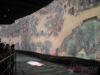 一進館我們乘電梯直奔“東方足跡”,春天的故事響徹大江南北,中華啊展開了嶄新的畫卷,追隨著這句鏗鏘有力的詩句,我們欣賞了一部展現發展巨變的紀錄片——和諧,這部影片極具表現力,震撼了我們的心,它從一個家庭入手,從衣食住行方面展現了生活的巨變,我們不禁由衷的贊嘆:祖國您變化真大,簡直就是一天換一件新衣啊。從這個影院里走出,剛剛電影里的一幕幕還在腦海中不斷呈現。各種場景是那么逼真。伴隨著輕快地腳步,我們又搭乘時光隧道,回到北宋年間,欣賞張擇端的《清明上河圖》,畫上的人物栩栩如生,讓人有種身臨其境的感覺。聽旁邊的導游說是用一塊長100米寬2米的屏幕播放出來的。