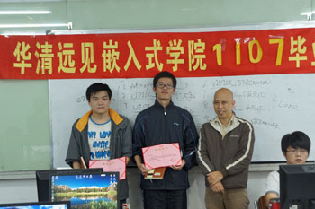 通過評委老師的綜合考慮,評出了優秀項目組與優秀學員的名單。后緊張的時刻到了,梁老師宣布項目答辯優秀小組和優秀學員,并且分別為他們頒獎,這期的項目組是由“遠程安防視頻監控一組”與“USB WIFI組”獲得。獲得優秀學員分別有:楊蔚、李小東、溫強、黃積玉。看著學員們燦爛的微笑本次畢業典禮也進入了尾聲。