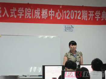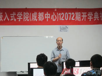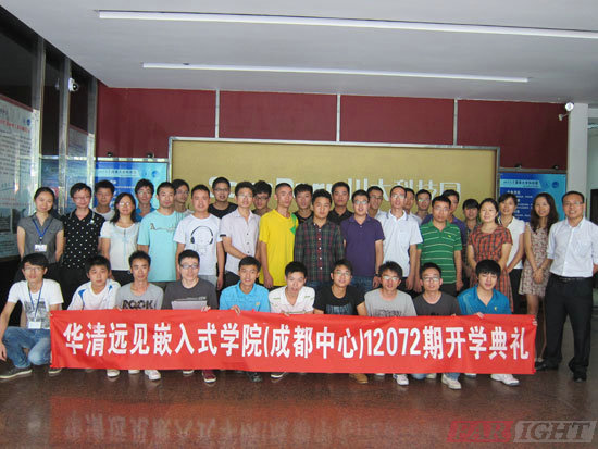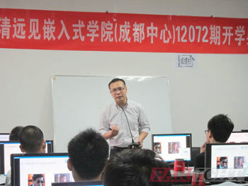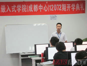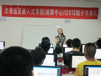 2012年8月6日,華清遠見教育科技集團成都中心12072期學員開學典禮在嵌入式實驗室805隆重舉行。參加本次開學典禮的老師有成都中心校長陶老師,教學部的潘老師、朱老師、姜老師,品質保障部的黃老師等。開學典禮由班主任張老師主持。