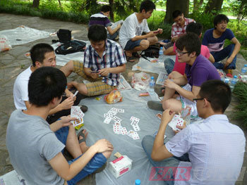 我們向梁洲方向行進,頂著炎炎烈日感覺快被烤化了。走了好長時間,眼前一亮-----一個長廊,大家就像抓住了救命稻草一樣,迅速鉆進長廊里。“好涼快啊”“就這兒吧,不走了”,大家決定選擇此地開展活動了,有動手鋪臺布的,有把吃的東西準備出來的,大家忙得不亦樂乎。接下來有的學員打撲克,有的補充能量,有的聊天,大家都處在輕松愉快的休閑氛圍中。