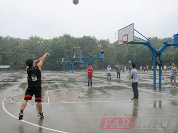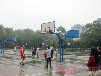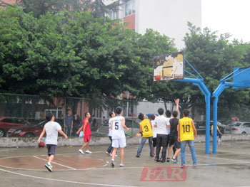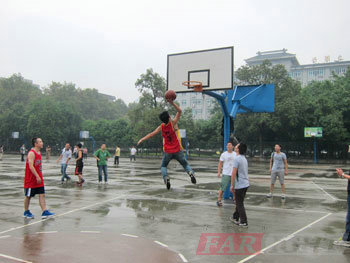 看,我們的學員們已經等不及了,一個個躍躍欲試,在場上練了起來。雖然天空飄著小雨,地面還有點滑,但大家的激情不減,斗志十足。籃球賽淘汰賽,第一組中,梁家強帶領第一隊大比分淘汰了王魚波帶領的第二隊,而第三隊和第四隊的淘汰賽打的非常辛苦,后羅宏坤帶領的第三隊僅以兩分的優勢險勝王亞蘭帶領的第四隊。一些學員利用中場休息時間開始了表演賽。投三分的,扣籃的,三步上籃的,各個英姿颯爽,精神抖擻,就連我們的女裁判也忍不住表演了三步上籃,贏得了周圍一片喝彩聲。隊員們稍作休息之后,將進入籃球決賽。
