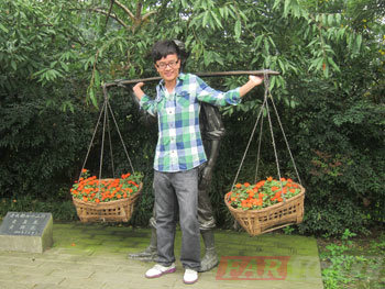 離開牛王廟,順著紫薇路向前走,然后右轉是水杉路,沿途大家發現了很可愛的無色雕塑,具有川西風格的農家樂。有不少在農家樂辦喜宴和壽宴的人家,一派喜洋洋、樂融融的景象。繼續前行,我們還看到了酒吧,吉他店,小工藝品店等等。有學員忍不住進入工藝品店挑選小禮品,其他學員則在店外休息。休息過后,我們繼續前行,這時一位來自北方的學員指著樹上的柚子問:“這是什么花呢?”這一問,樂壞了旁邊的同學,一邊笑,一邊解釋:“哥們,這可是貨真價實的柚子樹啊!”