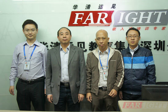 2012年11月23日,在華清遠見深圳中心梁健全校長的熱忱邀請下,湖南工學院張書記和劉老師兩位到訪華清遠見深圳中心。與深圳中心梁校長及夏老師進行了深入的交談。交談過程中,梁校長首先介紹了華清遠見的基本情況、近期培訓教學的開展情況及未來在行業(yè)內的發(fā)展規(guī)劃,并針對我們華清遠見嵌入式教學項目和新自主研發(fā)的Cortex-A8教學實驗平臺作了詳細的介紹,接著在梁校長的邀請下兩位分別參觀了華清遠見深圳中心的現場教學及研發(fā)的專業(yè)圖書和教材。