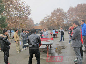 稍作休息之后,是激動人心的乒乓球決賽。經過淘汰賽,組長對本組成員的實力有了進一步的認識,由于是團體賽,出場的順序顯得尤其的重要。在周圍觀眾的加油助威聲中,比賽已經進行到了第三局,因為前兩局都由第三組獲勝,所以這一局對第一組成員來說顯得尤其的重要。而第三組的成員們更想贏了這場比賽,結束整個賽程。場上的比分一直咬的很緊,裁判盯著桌案上的小小乒乓球,小心的統計著分數!百慄c!”有人喊了出來,而大家的心也隨著這一聲叫喊,跟著緊張起來。終于,第一組扳回一局。接下來的一局,第三組派出了具實力的選手組長高磊,而第一組也派出了該組高手中的高手李癸佑。一場精彩的比賽正式上演。在眾人的加油聲,喝彩聲,歡呼聲中,第三組終于取得了乒乓球團體賽的勝利。