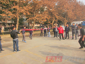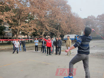 接著,進行的是羽毛球的自由組合比賽?紤]到時間的因素以及場地就近原則,就在乒乓球臺旁邊空出的停車場舉行,我們的學員別出心裁的拿出了活動橫幅拉起了一張會動的網,而我們的隊員有的是臨時組合,有的是經常在一起打球,這樣很快就淘汰了兩組,剩下了三組,進行輪賽,其中張鵬和丁明配合的很默契,連勝兩場,取得了羽毛球比賽的勝利。