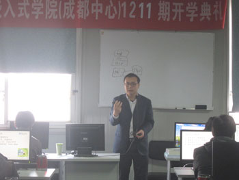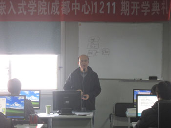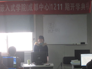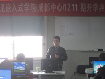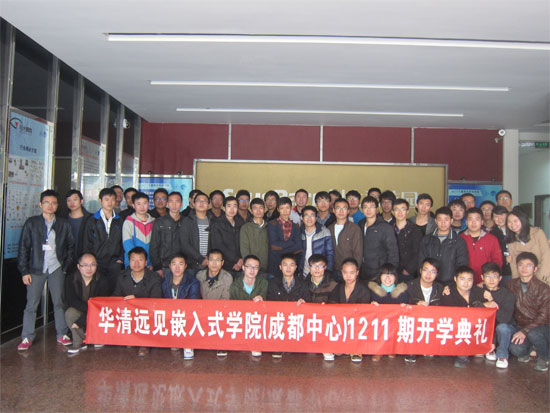 2012年11月19日,華清遠見教育科技集團成都中心1211期學員開學典禮在嵌入式實驗室805隆重舉行。出席本次開學典禮的老師有成都中心校長陶老師,教學部的潘老師、朱老師、品質保障部的黃老師、龔老師等。
