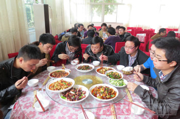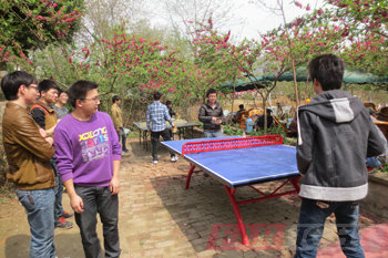 在輕松的氛圍中,時(shí)間慢慢的溜走。很快到了午飯時(shí)間,大家驅(qū)車來到幸福梅林的一農(nóng)家小院,院子里載滿了桃花,各居枝頭,爭(zhēng)奇斗艷。飯前,學(xué)員們有的坐在桃花叢中懶洋洋的曬著太陽,有的品著小茶,有的蕩著秋千,有的打起了乒乓球,好不愜意。飯點(diǎn)一到,大家迅速坐好,等著開飯。真是心情好,胃口就好,一大桌的農(nóng)家美食,漸漸見底。吃飽喝足,到小院兒里散散步,以助消化。