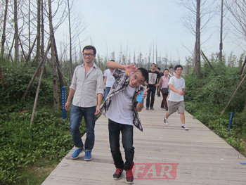 午餐過后,休息了半個小時,我們沿著賞荷路,前往濕地公園。夏已盡,蓮蓬探出了水面,但荷花還沒有完全凋謝,睡蓮還美美的躺在水上,有紅色的蜻蜓立在荷葉上,引來不少學員圍觀,拿出相機抓拍,小家伙很配合,一動不動,有學員懷疑它的生命狀態,伸手捧起水灑向它,由于受到了驚嚇,蜻蜓急急的飛走了,這時還在認真拍照的學員對剛剛灑水的學員表示不滿,而他卻擺好POSE,說到:“別生氣了,大不了我委屈點兒,讓你拍好了。”俏皮的話語、生動的表情把周圍的學員都逗樂了,又有幾個學員加入,笑著說到:“好啊,好啊,我們也來吧!”就這樣,大家一路上有說有笑,趣事不斷。