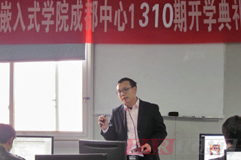 上午9點,開學典禮正式開始,首先,由華清遠見成都中心校長陶老師為本次典禮致辭。陶老師代表成都中心對1310期全體學員表示熱烈的歡迎。作為嵌入式行業資深的職業規劃師,陶老師結合自己多年在嵌入式領域的工作經驗,分析了嵌入式行業的現狀、前景,向學員們介紹了華清遠見的發展歷程、師資隊伍,同時也對新學員們提出了殷切期望:希望他們能夠刻苦學習,掌握學習方法,調整學習心態,遵守學院的規章制度并通過正確的渠道及時的反映問題,要懂得堅持,期望他們經過四個月的學習能夠學有所獲,成為優秀的嵌入式研發人才。