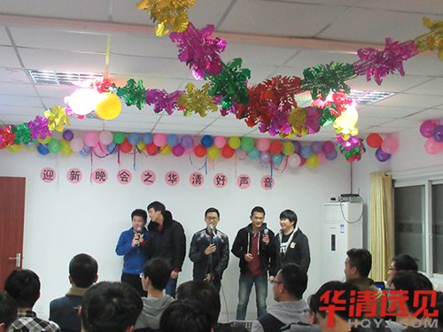 前方舞臺是我們老師特別布置的,有沒有很溫馨~ 晚會現場(第六教室)十分熱鬧,所有學生整整齊齊的坐好, 座位中間還擺放了瓜子花生,同學們可以邊吃東西邊看節目。 六點鐘晚會正式開始, 首先為大家播放了一段2017年度上海華清學員搞笑集錦視頻, 讓大家先開心一下。 接著精彩的節目就開始啦! 首先,111班和91班分別帶來了兩個歌唱節目《好漢歌》和《我的好兄弟》。