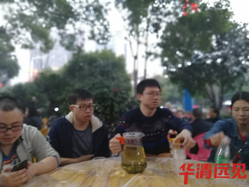 笑鬧間,時間如白驥過隙,很快,太陽下山,看夠了美景,玩足了游戲,到了改填飽肚子的時間,大家收拾好地上垃圾,收好自己的東西,結伴往吃飯的地方走,我們的黃老師是一個幽默的人,一個個在走不動的時候,為了給我們動力,告訴我們:“看,前面那個徐記海鮮,看到沒有?”齊聲回答:“看到”。大家心理犯嘀咕,這么高檔,每個人20塊錢能吃的起嘛?黃老師說:“嗯,旁邊毛家飯店看到沒有?”齊聲回答:“看到了,”又在心理想,這毛家飯店應該是平價消費。然后,到了正門不進,大家心理嘀咕,這是走后門?最后,串過小巷,來到了黃老師所說的,“森林餐廳”。