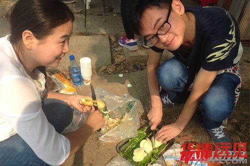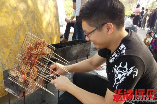 由班長帶領,終于找到了一塊不多的空地,大家各自擺好工具、飲料、食物、油鹽等作料,炭爐已經開始準備生火,洗完菜的同學把腌制好的雞翅、火腿也都一并串上,燒烤活動正式開始……