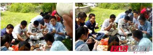 一路上邊說說笑笑邊欣賞著沿途的風景,中午12點左右我們到達目的地,休息片刻,我們開始了野餐活動,豐盛的午餐讓大家情不自禁的圍坐成圈,開動起來。