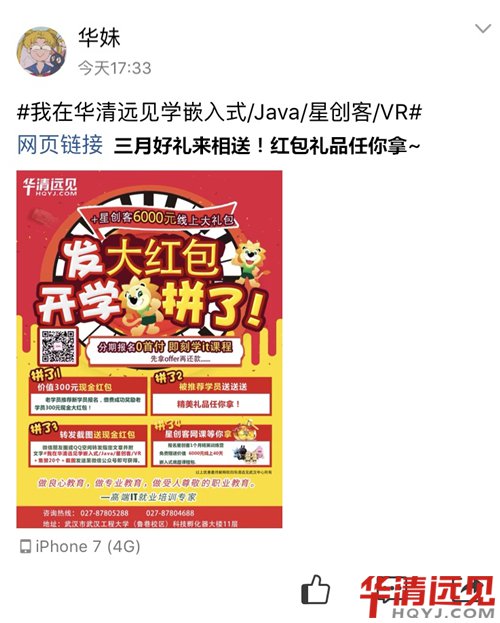 活動三:微信朋友圈或QQ空間轉發本文并附文字 #我在華清遠見學嵌入式/Java/星創客/VR +積贊20個+截圖發送至“華清遠見武漢中心”微信公眾號,即可獲得現金大紅包喔。