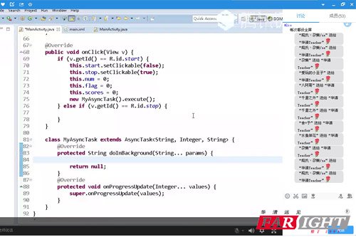 接下來,就要正式進行編程啦!開發“打地鼠”這款游戲,基本需要實現7個功能: (1) 游戲框架設計; (2) 游戲中各個Activity之間實現數據傳輸; (3) 按鍵的設計與實現; (4) 得分的設計與實現; (5) 規定時間的設計與實現; (6) 地鼠的出現的設計與實現; (7) 按鍵觸發事件的實現。 編程過程中,王老師不時講解著目前安卓游戲開發的重點和難點,并帶領著課堂上的小伙伴們通過一行行的代碼,一步步的實現,逐步勾勒出打地鼠小游戲輪廓和細節。而認真聽課并跟隨王老師思路的小伙伴們也不斷提出在編程過程中遇到的問題,王老師也一一解惑答疑,聊天框不斷被鮮花刷屏,顯示了大家對王老師的認可和喜愛!