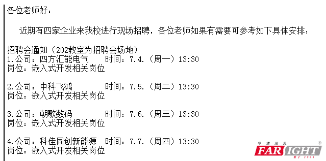 剛接到消息,由于有班級即將畢業,北京校區將在七月初有合作企業來招聘,請小伙伴們積極準備,爭取一下搞定工作。部分企業安排具體行程如下: ![]() 圖:郵件源內容 此次招聘會,只是一個開始,后續預計還有8-10家公司來校。請各位同學務必在老師的指導下準備好簡歷和好好復習。愿下周都給你們帶走! 招聘會具體地點:華清遠見教學樓 相關資訊