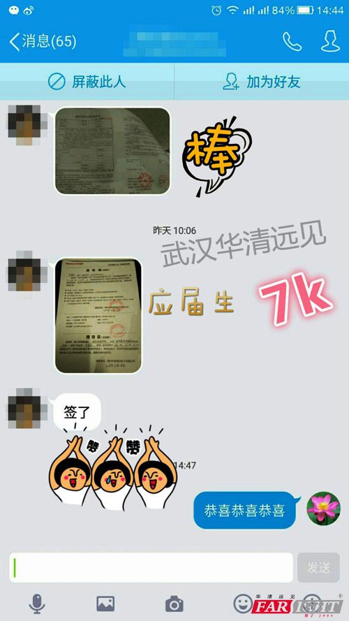 短的七天和長的七天,都過去了,來聽聽華妹給大家?guī)淼暮孟⑷绾危?/p> 華清遠(yuǎn)見武漢中心16071班李同學(xué),湖北科技學(xué)院2017屆畢業(yè)學(xué)生,電子信息科學(xué)與技術(shù)專業(yè),被惠州華陽通用電子公司錄用,薪資7k。