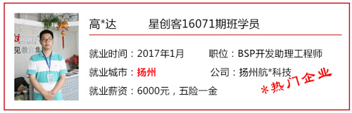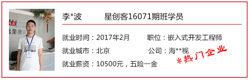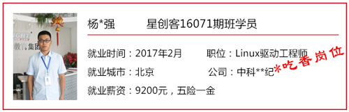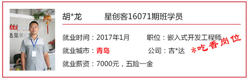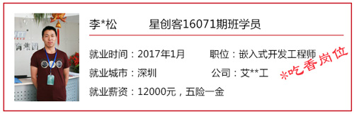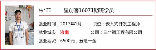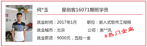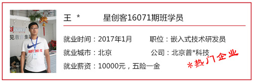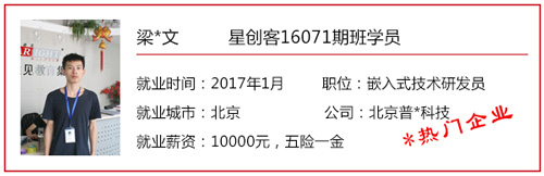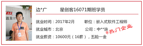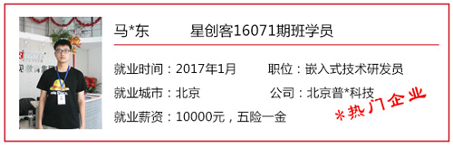星創客精英訓練營自開辦以來,匯集了眾多創客愛好者/技術精英,也送走了一批又一批的高端嵌入式/Android底層開發人才。 目前,星創客16041期班已于2016年9月30日正式結業,就業率100%,高就業年薪19.2W,平均就業年薪14.4W; 而星創客16071期班也于2016年12月23日正式結業。畢業前夕,在就業老師的安排下,同學們參加了多個企業上門招聘會,收獲頗豐,多位同學不出校門就拿到了高薪offer! 星創客學員高薪入職普路科技,厲害了word哥! 還沒畢業就成功受到企業青睞,星創客學員都這么牛X! 在隨后的社會招聘中,更多的星創客們“后來居上”,在畢業后的15個工作日內,班內近一半的同學找到了心儀的工作,帶著高薪offer與笑容回家過了個開心年! 轉眼間,春節已離我們遠去,年后歸來的小伙伴們,繼續為找工作而投出一份份簡歷。截至年后第11個工作日,星創客16071期班總就業率達100%!同學們的就業行業涉及包括信息安全、學術/科研、智能裝備、汽車電子、智能交通、機電設備、物聯網、設備檢測、智能芯片、軟件外包等熱門領域。 想知道他們的就業薪資是多少嗎?下面來看看星創客16071期班的明星就業學員吧!