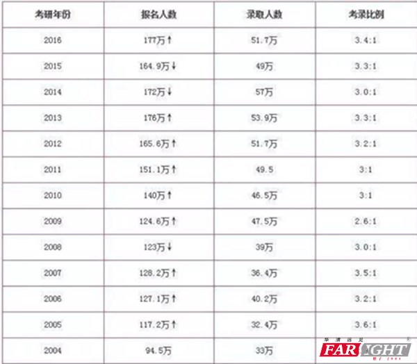 是不是感覺報考人數(shù)在下降的趨勢,是不是意味著考生成功考上公務(wù)員的幾率變大了呢? 其實不然,考得好不如報的好。如2015年山東公務(wù)員考試高職位競爭比為16885:1.該職位為濟南市市中區(qū)教育局綜合管理崗位,計劃招錄一人,主要從事機關(guān)教育管理相關(guān)工作,報考條件均可報考。 不要說一不小心跳進千軍萬馬過獨木橋的萬人坑,就是連年不到3%的平均錄取率,就問你怕不怕? 應(yīng)屆畢業(yè)生考取公務(wù)員有十足的動力,非她不娶;在職考取公務(wù)員,非他不嫁的態(tài)度。 試問難道除了考公務(wù)員就無路可選??? NO NO NO 有同學(xué)說是考研,那么我們再來看看考研的數(shù)據(jù) 大部分學(xué)生,鑒于壓力選擇自我能力提升——考研,于是就有了下圖。