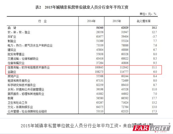 從上表可以看出,非私營單位中,盡管金融業(yè)增幅相對較低,但平均工資高達114777元,仍居各行業(yè)首位。年平均工資低的行業(yè)是農(nóng)、林、牧、漁業(yè)31947元。高與低行業(yè)平均工資之比為3.59%。此外,采礦業(yè)平均工資同比下降3.7%,為多年來首次出現(xiàn)工資負增長的行業(yè)門類。 為什么會有這么大的差距?