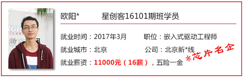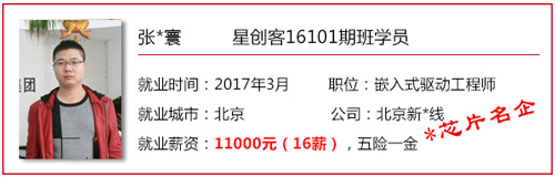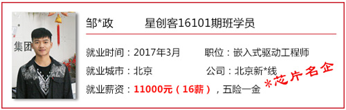 我們的法國(guó)名校畢業(yè)的高材生肖班長(zhǎng)也有出鏡哦!他也分享了自己在星創(chuàng)客的學(xué)習(xí)感受:“5個(gè)月的學(xué)習(xí)雖然枯燥、嚴(yán)格,但我卻樂(lè)在其中,因?yàn)槲疑磉呌锌炭唷^斗的同學(xué),還有孜孜不倦、教導(dǎo)我們的講師。給我印象深的就是潘老師,我感覺(jué)他是“百事通”,無(wú)論什么問(wèn)題都能回答出來(lái),對(duì)他十分敬佩!另外,在此我想告訴各位學(xué)員,‘未來(lái)的你會(huì)感謝現(xiàn)在拼命的自己’,有付出才有回報(bào)!后,感謝華清老師們對(duì)我的教導(dǎo),希望有一天我也能成為華清的講師,來(lái)報(bào)答對(duì)我的栽培!” 目前,肖班長(zhǎng)正在追求更高的目標(biāo),華妹看好你喲! 更多星創(chuàng)客3期班就業(yè)戰(zhàn)報(bào)正在趕來(lái)的路上~華妹將全程跟蹤報(bào)道! 如果你和他一樣,癡心于智能硬件開(kāi)發(fā),希望將智能硬件開(kāi)發(fā)領(lǐng)域作為自己的職業(yè)未來(lái),那么快來(lái)加入我們吧! 看看星創(chuàng)客們?nèi)绾瓮孓D(zhuǎn)智能硬件開(kāi)發(fā): //m.dimor.cc/emb/news/school/7547.html 星創(chuàng)客17041期4月19日開(kāi)班,目前正在火熱報(bào)名中!詳情戳: //m.dimor.cc/emb/courses/gaoduan.html 相關(guān)資訊