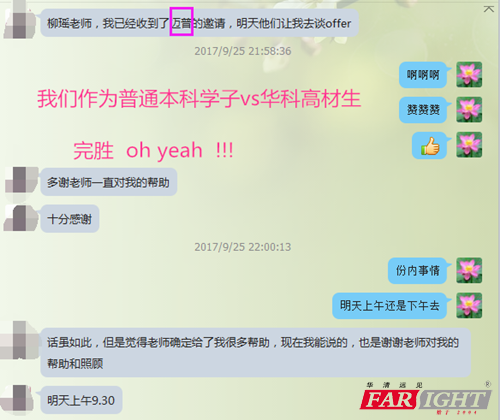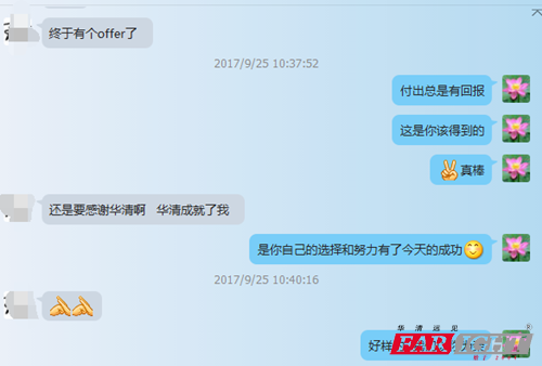 17021班 王同學 17021班的王同學拿到了年薪18w+的offer,王同學來自南昌大學,18年研究生畢業,7月份從華清畢業。拿到offer之后向就業老師表達了感激之情,感謝華清成就了他。