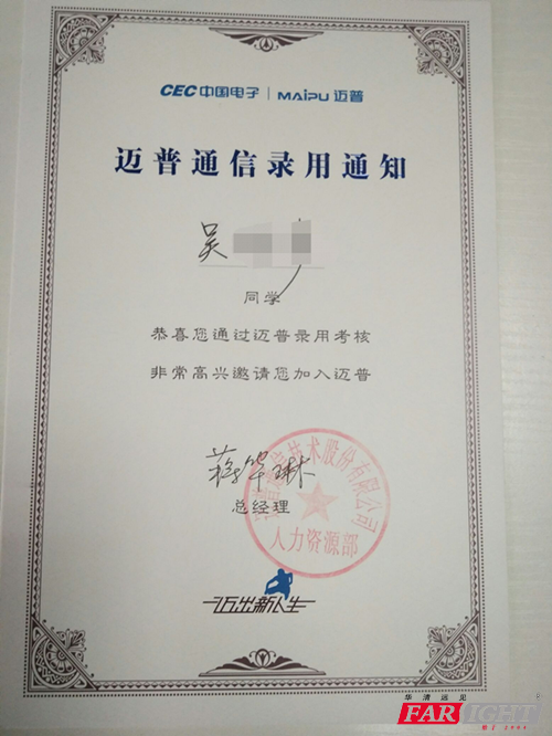 小編的一位朋友也是如此,“落差感”是她在參加校招過程中大的感受。但是越是面對至關重要的抉擇和考驗,我們就越要靜下心來考慮清楚自己本身究竟想要什么,適合什么。在有了一個大致的方向之后,再有技巧地去投簡歷。有了充分的能力儲備自然是成功的前提,后期工作得以有條不紊地進行更是在找工作中有所收獲的保障。 武漢華清的老師們近也頻頻收獲了一些校招捷報: 17061班 江同學 17061班的江同學拿到了年薪10萬到13萬的offer,任職C開發工程師。江同學來自武漢紡織大學電子信息工程,2017年畢業。拿到offer之后表示近幾天都陸續有同學拿到了很好的offer,很感謝華清!