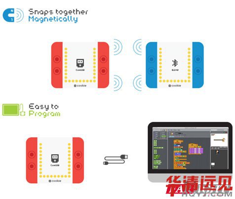 Microduino mCookie號稱腦洞達(dá)人的愛,它讓Microduino獲得了兼容樂高玩具的能力,Microduino mCookie 每個模塊制作的標(biāo)準(zhǔn)相同,功能用顏色進行區(qū)分,方便制作者通過堆疊來連接和添加每個模塊。Microduino mCookie 模塊的四角里內(nèi)置了四個磁石,制作者能夠迅速的連接和添加 mCookie 模塊單元,不需要焊接等復(fù)雜的操作,有意思的是相互不兼容的模塊,會通過磁力「拒絕」對方。