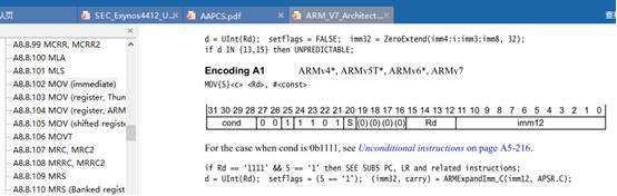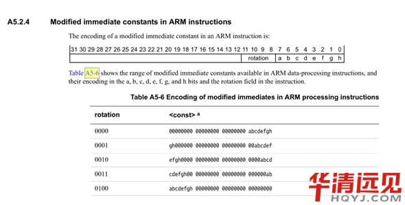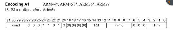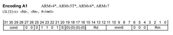 指令中的立即數是由一個 8 bit 的常數移動 4 bit 偶數位(0, 2,4, …, 26, 28, 30)得到的。所以,每一條指令都包含一個 8 bit 的常數 X 和移位值 Y,得到的立即數=X 循環右移(2×Y)