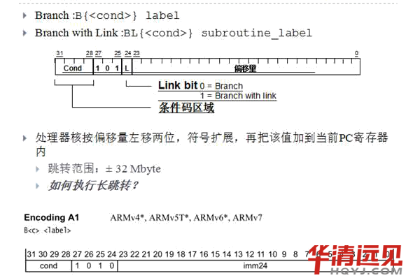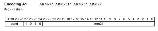 31),每個指令4個字節,[1:0]兩bit位始終為0,所以B指令偏移量能表示的范圍為FFFFFF*4,所以B指令跳轉的范圍為64M,由于可以向前向后跳,所以B指令的跳轉范圍為+-32Mbyte