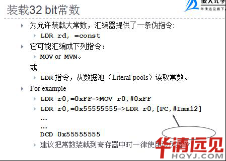 通過pc值加上一個偏移量得到一個地址,然后將地址中的值給寄存器,編譯器會將ldr偽指令的數編譯到程序的某一位置,存放這些常量的位置成為數據池